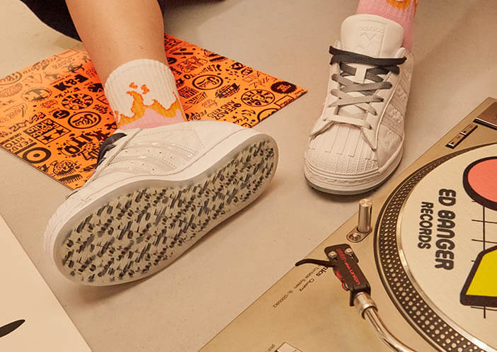 L’enseigne Courir enchaîne les sorties de sneakers exclusives. Et pour célébrer les 40 ans, la maison a lancé une collab pour chaque décennies. Pour les 80’s, Puma et Pac Man sont à l’honneur, pour les 90’s c’est Reebok et le film ‘La Haine’ qui, par la même occasion, fête ses 25 ans. Pour les années 2000 c’est Adidas et le label Ed Banger. Puis pour les années 2010 c’est Nike et Andrea Crew (un collectif dirigé par Maroussia Rebecq, une créatrice de mode adepte de l’upcycling). Et vous savez quoi, ça tombe bien parce que la collab la plus réussie selon Star Wax c'est celle d'Adidas et de la maison de disque Ed Banger. Certes, la Superstar est un modèle emblématique grâce au titre « My adidas » de Run DMC et c'est celui que j’ai le plus souvent porté. Mais il faut avouer que Pedro Winter, épaulé de Michael Dupouy de La MJC, c’est lâché. Adidas a accepté de réaliser un moule unique du shell-toe (la mythique coque de devant) avec des notes de piano. Et il y a des logos d’artistes du label embossés sur le cuir blanc. L’intérieur et le dessous de la semelle sont imprimés d’un monogramme spéciale. Puis chaque cotés de la boîte de sneaker sont aussi personnalisés. Vu de haut ca fait penser à un bac à vinyles… Enfin le papier, à l’intérieur de la boite, pour recouvrir la Superstar Adidas x Ed Banger est imprimé d’une partition d’un titre du catalogue d’Ed Banger. La dernière surprise à découvrir, c’est de quelle œuvre s’agit-il ? Certifié fat par Star Wax ! En exclusivité chez Courir.