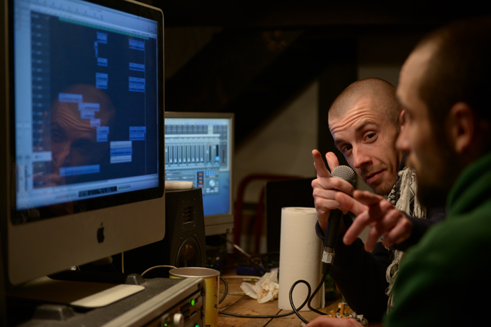 Maya : Bah, il est arrivé, je ne pense pas qu’il avait vraiment écouté le morceau. Donc on lui fait écouté le projet, on lui chantonne vite fait ce qu’on souhaiterait que ça donne. Et là, il fait 2 tests micro, 3 réglages, et hop.