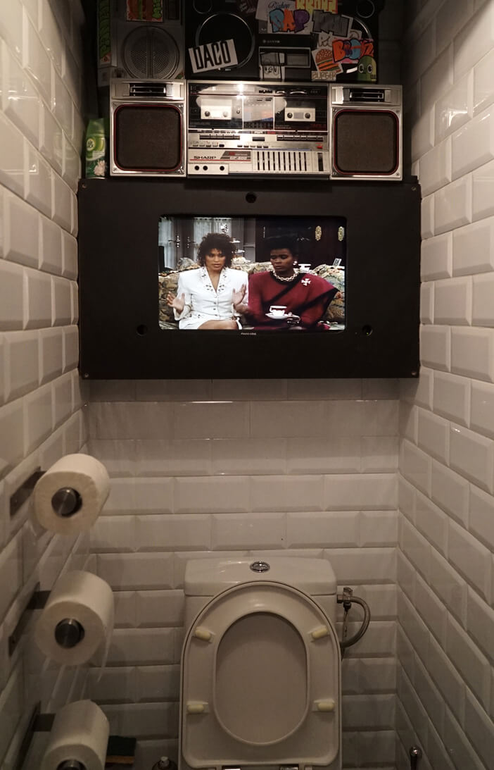 Ces dernières années les ouvertures de nouveaux restaurants de burgers se multiplient. Difficile de sortir du lot mais le Street Art B-Boyz Burger, ouvert à Paris il y six mois, a décidé de se démarquer en proposant tout un concept autour du burger et de la culture street. Lorsque tu entres au 5 avenue Trudaine la musique hip hop, principalement issue de la période golden years américaine, n’a de cesse de sortir des enceintes avec un niveau sonore modéré. Facile tu vas me dire sauf que les quatres associés ont décidé de pousser le concept bien au delà. Tout d’abord la carte en forme de pochette de vinyle annonce des burgers aux noms de rappeurs comme le Tupac, le monstrueux Biggie burger pour les amateurs d’East Coast ou encore le Rahzel Burger. Les enfants, eux, ont droit au menu Kid Cudi. Concernant la décoration soignée, outre un impressionnant mur de ghetto blasters personnalisé par deux street artistes parisiens, il y a un autre pan de mur recouvert de pochettes de vinyle de rap et des œuvres, sous verre, exposées ici et là. Ce qui est fort marrant et original c’est la diffusion en boucle d’épisodes de la série « Le Prince de Bel Air » sur un écran de télévision lorsque tu vas aux toilettes (photo ci-dessous). Puis une fois les mains propres, en sortant, tu peux saluer le cuisinier tout en tapotant sur une Mpc fixée au mur. À la fin de ton repas l’addition est amenée dans un boitier de cassette audio. Les jeunes entrepreneurs ont pensé au moindre détail, nous te laissons le plaisir de découvrir les autres.