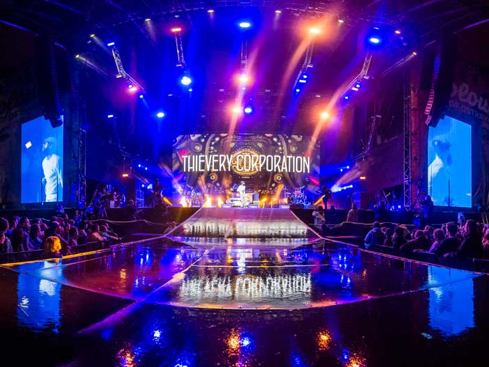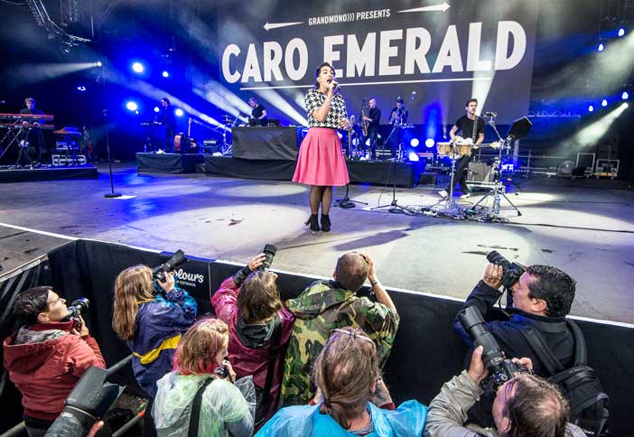 Des artistes internationaux qu’on ne présente plus comme Underworld, Tame Impala, M83, Of Monsters And Men, Thievery Corporation (en photo ci-dessus), Slowdive ou encore Anohni. Vous avez cerné : la dominante musicale est encore une fois rock, même si, par exemple, Mbongwana Star est également au programme. Mais ce festival est aussi l’occasion de découvrir des groupes croates comme le duo 2Cellos ou encore le trio pragois Ohm Square qui joue une musique électro-pop downtempo emportée par une chanteuse anglaise qui fait face à un filet sur lequel le vidéo jockey projette des images. Le public est conquis et nous aussi. Le lendemain, sur la scène principale, alors que la pluie n’a de cesse de tomber, nous sommes séduits par la prestation de la néerlandaise Caro Emerald avec un big band et un Dj (ci-dessous en photo). Ils remettent au goût du jour des morceaux de jazz des années 40 sous forme d’électro-swing. C’est efficace et festif. Parmi les douze scènes pointées, nous passons pas mal de temps sous l’un des plus petits chapiteaux, aux couleurs du rhum Captain Morgan, en mode discothèque. C’est la scène qui joue tardivement dans la nuit. Les Djs enchaînent habilement et sans temps mort de la house, du hip-hop ou de la jungle bien soulful.