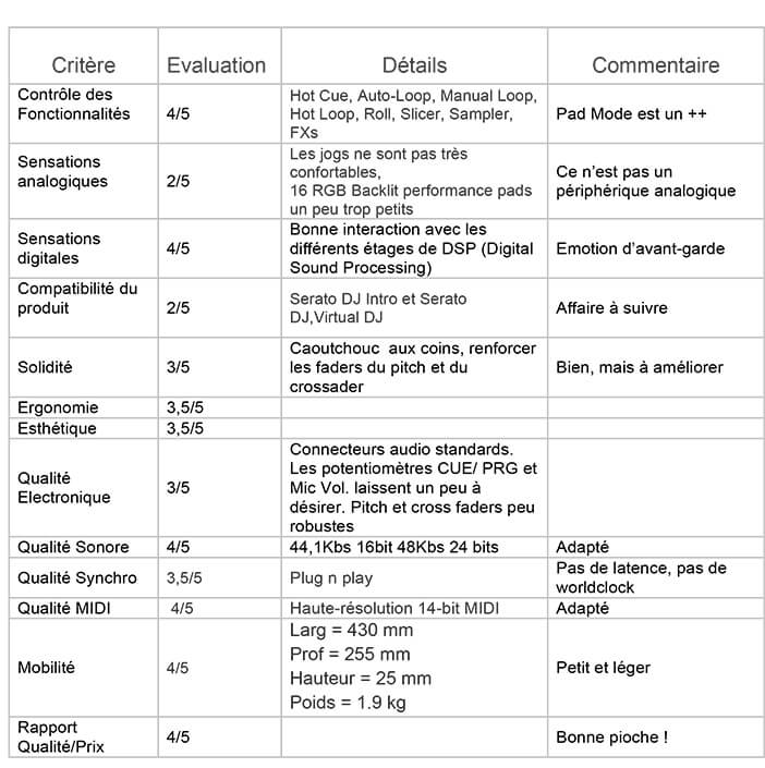 Dès la prise en main, la machine semble robuste. Le SLATE 4 possède une interface physique un peu particulière par rapport aux autres contrôleurs. Malgré ses nombreuses fonctionnalités, nous pouvons tout de suite constater la bonne optimisation de l’espace. En effet le SLATE 4 mesure 255 mm de large, 430 mm de longueur et 25 mm de hauteur pour seulement 1.9 kg. L'interface audio et la connexion USB Mini sont sur le côté gauche, ainsi que la prise casque et l’entrée microphone. Les pads rétro-éclairés sont un peu petits mais de bonne qualité, avec un bon point de frappe. Les Pitchs ont une course un peu trop courte. Après quelques semaines de tests, nous avons remarqué que ce sont les pièces les plus fragiles. Les Faders offrent un feeling un peu raide mais ils sont bien calibrés pour le mix. Le Crossfader est étonnant, il fait presque penser à un Innofader. Il donne bien envie de scratcher. Mais dommage que les ingénieurs n’ont pas prévu une entrée auxiliaire pour brancher une platine vinyle à côté. Les autres boutons, Shift et Back, sont de moins bonne facture. En revanche les Jogs Wheel Contrôle sont agréables, même si on est d’accord que le touché est différent de celui d’un vinyle. Les Knobs (potards) ont un bon grip notamment ceux pour le contrôle des volumes Out (les potards au milieu de la table mix). Sinon les autres ont une qualité standard. Les Deck Sel (sélectionneurs de platine 1 ou 3 / 2 ou 4) sont bien placés. Nous avons bien apprécié les filtres semi-paramétriques et surtout le filtre passe-bande pour chaque canal.