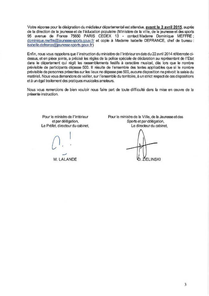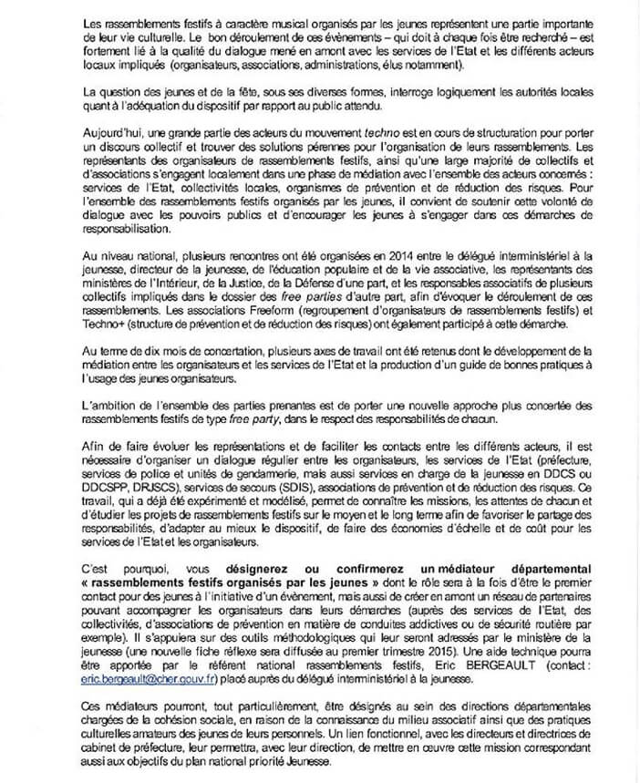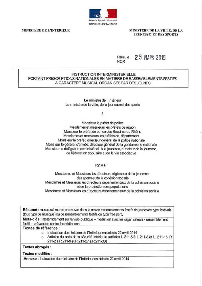 Le 25 mars dernier une nouvelle circulaire sur les free party est sortie. Un soulagement pour certains, notamment pour l’asso Freeform qui, active depuis deux ans, a pour but de regrouper des personnes physiques pour défendre, promouvoir et faire progresser la culture free party. Nous n’allons pas revenir dans cet article sur l’ensemble du dossier mais sur les avancées. Même si le seuil légal de capacité d’accueil de 1500 personnes pour une fête libre amateure demandée par Freeform n’a pas été retenue il est autorisé jusqu’a 500 personnes depuis plusieurs années, cependant ce n'est pas toujours le cas en pratique surtout si votre teuf n'est pas déclarée en préfecture. Donc, la nouvelle réjouissante est que la loi précise qu'aucune saisie de matériel n'est permise si il y a moins de 500 personnes sur le site de la free party. Puis le véritable changement annoncé dans la circulaire (ci-dessous) est que des médiateurs vont être désignés d'ici le 3 avril dans chaque département pour favoriser le dialogue entre les autorités et les organisateurs de rassemblements festifs autour de la musique électronique (rave parties, teknival…). Leur rôle sera à la fois d’être le premier contact pour des jeunes à l’initiative d’un évènement mais aussi de créer en amont un réseau de partenaires pouvant accompagner les organisateurs dans leurs démarches.