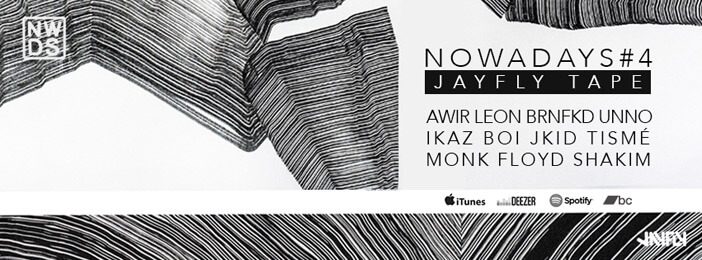 Suite à Nowadays #3 / Spring sortie au printemps dernier Nowadays Records qui n’a de cesse de signer de nouveaux talents (La Fine equipe, Fakear, Douchka… ) enchaîne avec Nowadays 4# - Jayfly Tape. Cette sortie annonce encore un vent de fraîcheur puisque les habitués du label sont absents. Place à la découverte de cinq beatmakers, J.Kid, Awir Léon, Tismé qui n’est pas à son premier essai, Ikaz Boi, Monk’, tous issu du collectif pluridisciplinaire Jayfly. Le titre « Marble Flavour » avec son synthé planant est l’union du travail de Monk’ et Ikaz Boi sous l'identité BRNFKD. Le titre « Narrow Skies », qu’en à lui, est produit par J.Kid, Awir Léon et Tismé qui, ensemble, forment Unno. Le trio élu pour la prochaine sortie d’un label prolifique et fidèle à un hiphop instrumentale bien cousu. L’artwork a été confié à 2051, un illustrateur italien. Nowadays vol.4 / Jayfly Tape, à se procurer, est disponible en free download ci-dessous cependant vous pouvez aussi soutenir cette sortie en proposant le prix de votre choix.