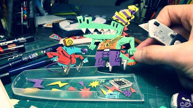 À vrai dire j'ai découvert le concours deux ou trois jours avant la date butoir. Donc j'ai fait quelques recherches qui n'ont mené à rien, j'avais un croco en papier découpé qui traînait, quand je l'ai vu j'ai foncé au feeling pour rester dans les temps. J'ai fait des galettes en carton noir d'après le gabarit fourni, un mix de dessin direct et sur des stickers au Posca. J'ai fait des montages en découpant et collant directement, histoire de bien me mettre à la bourre.