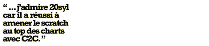 Bien sûr, j’en ai toujours mis dans mes prods. C’est d’ailleurs pour cela que j’admire 20syl car il a réussi à amener le scratch au top des charts avec C2C. Par contre, je ne suis vraiment pas doué, alors je collabore toujours avec mon fidèle Dj Adjectif, champion DMC en titre, un tueur !
