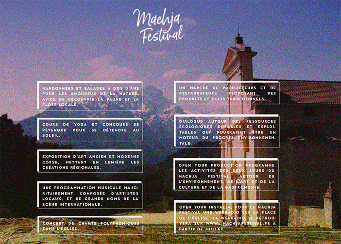 Tout d’abord parce que le lieu est idyllique. Le champ donne une superbe vue sur le Padru, qui est le deuxième sommet de Corse, et se trouve à 800 mètres d'altitude. C'est un pari risqué mais cela donne plus de valeur au festival. Machja Festival a pour but d'allier modernité et tradition, de réunir les générations comme ça a toujours été le cas lors de nombreuses fêtes du village. Les activités de jour attireront les visiteurs plus âgés et les familles tandis que la partie électro, le soir, s'adressera à un public plus jeune, même si tout le monde peut y participer.