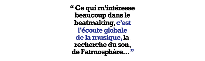 Ce qui m’intéresse beaucoup dans le beatmaking, c’est l’écoute globale de la musique, la recherche du son, de l’atmosphère, du groove, que beaucoup de musiciens spécialisés ne considèrent pas autant. Je parle de musique enregistrée ou produite. Souvent les beatmakers ne savent pas bien jouer d’un instrument et ça leur permet d’avoir une oreille détachée de la technique, et de penser la musique autrement, en cherchant plutôt des sons qui leur parlent, des rythmiques groovy, peu importe les notes et le rythme utilisés. Ce qui m’intéresse dans le beatmaking, c’est d’utiliser mes propres samples, puisque j’ai appris la musique et que je suis entouré d’excellents musiciens. Je compose beaucoup de musique que j’enregistre moi-même, et ensuite je m’amuse à la traiter comme un beatmaker qui utilise un sample. Ça peut partir dans tous les sens. C’est vraiment très stimulant.