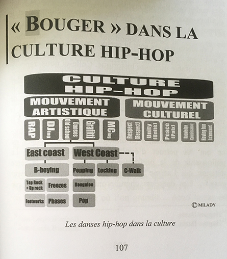 L’écrivain cite de nombreuses références bibliographiques : « L’Histoire de la Danse Est l’Histoire Sociale Du Monde » de Martha Graham interpelle. Pour transposer cela aux musiciens et aux producteurs, et par la même occasion rendre hommage aux Djs trop souvent en retrait, n’est-il pas plus juste d’écrire : l’histoire de la musique est l’histoire sociale du monde ? En effet est-il possible de danser sans musique ? Cette citation révèle aussi la difficulté de faire cohabiter ensemble différents modes d’expression. Et même si l’art est censé permettre d’ouvrir au reste du monde, les cinq disciplines du hip-hop (danse, rap, beatbox, graffiti et Djing) ne sont pas assez connectées entre elles - comme le souligne Milady. À noter que le livre se clôture par un riche lexique (attention les définitions de beat et de disc-jockey manquent de précision), suivi des dix-huit principes de la Zulu Nation écrits en anglais et en français. Puis par une carte d’identité des danses hip-hop.
