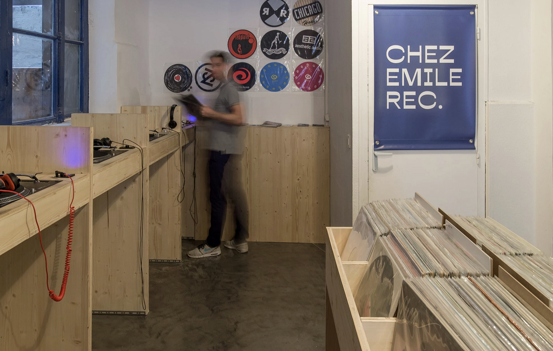 Lorsque nous avons ouvert Chez Emile (photos ci-dessous) avec Léo et Gaétan, il n’y avait plus de magasins spécialisés dans les musiques électroniques à Lyon depuis un moment. J’avais envie d’un projet de ce type pour quitter Saint-Étienne. Le marché du vinyle commençait à prendre un second souffle et c’était le moment opportun pour monter une telle structure. J’avais déjà un réseau de labels et de distributeurs grâce à Sharivari. Léo et Gaétan étaient déjà très bien implantés dans le milieu à Lyon et nous avons été rapidement bien entourés. Chez Emile est devenu un des principaux points de rencontre à Lyon pour les producteurs, les Djs, les patrons de label, les simples curieux ou les passionnés de musique électronique. Il a fallu habituer les consommateurs de vinyles à se déplacer dans une boutique de disques, surtout la nouvelle génération. Elle a toujours acheté ses disques sur Internet. Et bien sûr habituer la génération précédente. La création de Chez Emile Distribution nous a permis de passer à l’étape supérieure et d’élargir notre réseau en travaillant avec des disquaires et d’autres distributeurs du monde entier. Nous apportons un soutien non négligeable à la scène locale. Le marché du disque reste fragile malgré tout. Rien n’est acquis et il faut encore travailler.