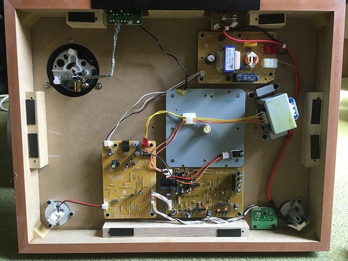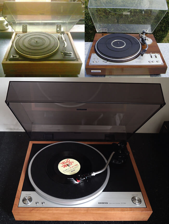 La Onkyo Dynamic Four 800 (1972), la Pioneer PL-530 (1976) et la Onkyo CP-1050 (2015) vu de dessus et de l'intérieur.