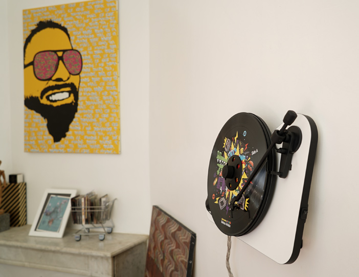 Nous avons eu l’honneur de tester en primeur l’un des premiers modèles fabriqués. La légèreté et la simplicité de l’objet sont appréciables dès la prise en main. Il y a l’option de visser au dos de la platine un pied afin de l’installer sur un meuble. Ou alors de le positionner, toujours verticalement, sur un mur. Pour l’option murale, il vous faudra dévisser ses pieds ronds et, à la place, revisser deux barres en métal qui font office de butées entre le mur et la platine. Ainsi qu’une tige permettant de la fixer à votre habitat. À l’exception d’une cheville et d’une vis pour la pose murale, toutes ces pièces sont fournies. Une cellule Ortofon est déjà fixée au bout du bras. Une fois l’alimentation branchée au courant puis les prises Rca connectées à votre ampli, il vous reste seulement à mettre la courroie. Le bouton on/off se situe sur la tranche. Il est temps de sortir votre vinyle, de le poser sur la feutrine et de visser, par dessus, le palet presseur afin d’éviter que votre vinyle ne se promène lors de sa lecture. Évidement ça fonctionne merveilleusement bien et, outre d’être pratique en termes d’espace, ça fait son effet auprès des invités.Petite surprise, ne cherchez par un interrupteur permettant de permuter de 33 à 45 tours parce qu’il faut changer la courroie d’étage de poulie selon l’usage. J’entends déjà rouspéter, mais pas d’inquiétude : la manipulation est simple. En revanche pour lire les 7 inch avec un large trou central, il faut l’« Adapt it », un accessoire supplémentaire à se procurer.