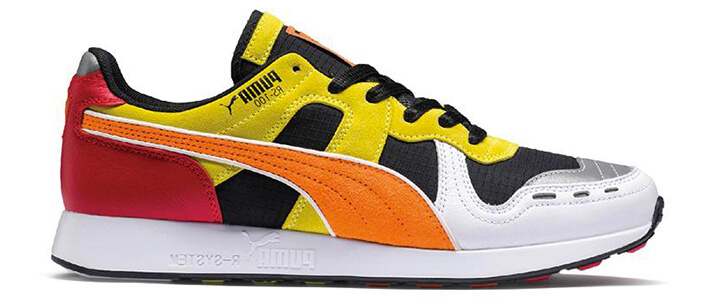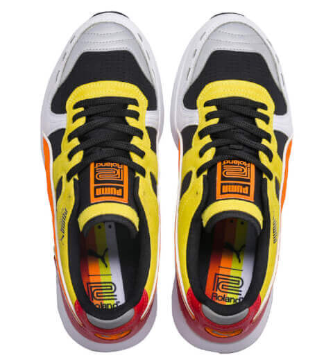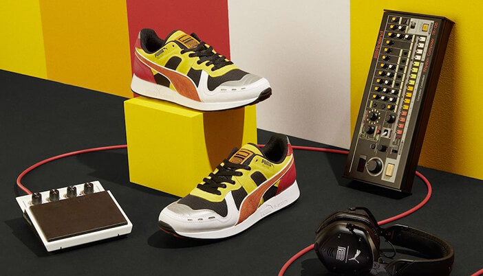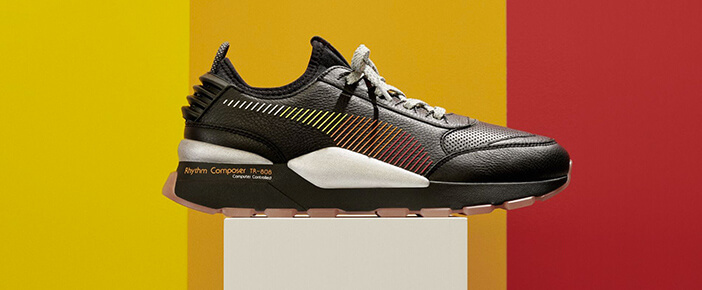 L’année 2018 a vu naître chez Puma, dans la catégorie running, la RS-0. Lors de ce premier semestre, un happening berlinois a ainsi révélé plusieurs collaborations : une avec Polaroid, une autre avec Sega, idem pour Ader Error ou encore Roland, clin d’œil à la TR-808. Modèle en noir, en photo ci-dessous. La firme allemande remet le couvert et lance en août un deuxième modèle, toujours aux couleurs de la TR-808. Cette fois, c’est la RS-100 qui revêt les couleurs de la mythique boîte à rythmes. Le résultat est une harmonisation entre deux objets lancés dans les années 80.