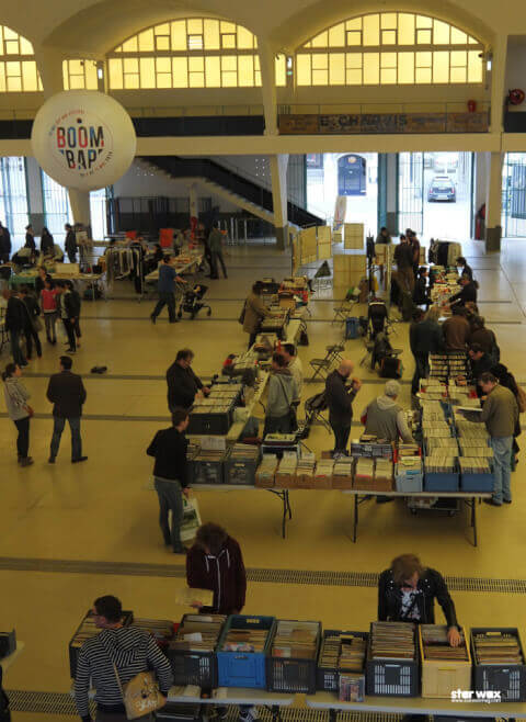 L’expérience Boom Bap commence le jeudi 8 mai pour la team Star Wax avec le BooMarket qui se déroulait aux Halles du Boulingrin, un des tout premiers bâtiment en béton réalisé en France par l’architecte Freyssinet en 1929. Une fierté aux dires des rémois rencontrés sur site, surtout depuis la réouverture en 2012 après 24 ans de non activité et une rénovation fort coûteuse. Qu’y trouve-t-on ? Du vinyle évidemment grâce à des disquaires et collectionneurs de la région qui ont fait le déplacement. Une chance que Cosa Nostra y ait posé ses bacs car avec son univers résolument électro-hip Hop et sa sélection très éclectique, il sort du lot des amateurs exclusifs de rock n’ roll, folk et musiques psychés ! A part cela, on y découvre des créateurs de sapes, de bijoux comme My Queendom For et son univers fantasque (à découvrir, vraiment) mais aussi des artistes peintres qui viennent trouver preneurs pour leurs œuvres. A noter que Posca, partenaire du festival a, comme à son habitude, souhaité laisser s’exprimer les jeunes et moins jeunes avec le célèbre espace Posca Libre Expression ! Petite particularité, la créativité des volontaires était amenée à s’exprimer en customisant des masques de chat, symboles de l’asso Velours. Et tout cela bien sûr en musique…