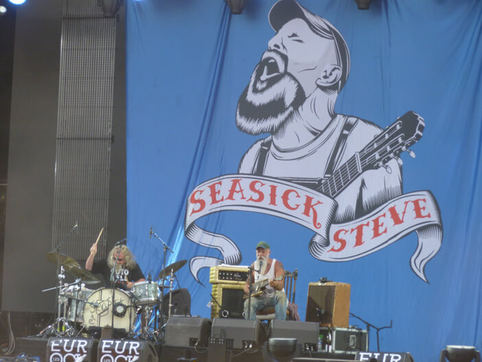 Il est 19 heures quand on débarque sur le site pour le début de Seasick Steve sur la grande scène. Le bluesman de 70 ans a été médiatisé relativement sur le tard. En effet après avoir côtoyé les plus grands ( Janis Joplin ou encore Kurt Cobain), le californien n’a sorti son premier album qu'en 2006 et il apparaît toujours devant nous habillé d’un bon vieux jean troué de grungeur, d’une vieille barbe blanche et d’un sourire qui en dit long sur sa joie d’être là ce soir. Il est accompagné d'un autre hurluberlu, non moins jeune que lui, qui est vêtu de guenilles toutes droites sorties d'un documentaire sur les bluesmen du Mississippi. Sa musique ne révolutionne certainement pas le genre, mais elle est jouée avec un tel amour qu'on ne peut que s'incliner devant la grandeur du musicien. « Je remercie la foule, ces jeunes qui me font l'honneur de venir me voir ». Il se trompe !!!! C’'est nous qui devrions le remercier d'avoir l'honneur de l'écouter. Pendant près d'une heure il va enchaîner quelques-uns de ses classiques accompagné de ses innombrables guitares trafiquées qui ont parcouru sa vie. La palme à une construction maison fabriquée de planches dont les esclaves se servaient pour laver et d'une seule corde fixe. Comme il le dit lui-même elle nous fait un "sound like a shit". Il se fendra même du superbe « Love Song » ou il invitera une jolie demoiselle du public à le rejoindre sur scène. Trois minutes de pur bonheur les yeux dans les yeux qui manifestement ne laisseront pas la jeune fille indifférente !! Elle est aux anges, le public aussi. Certainement le meilleur concert de ce cru 2015. Voir peut-être même plus. Fabuleux !!!