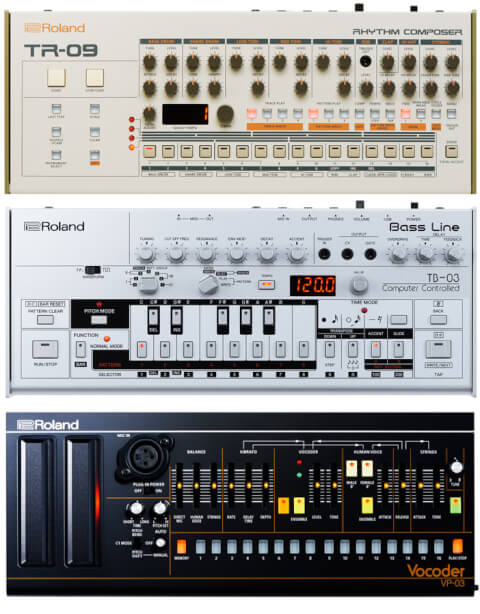 Roland réédite enfin deux machines mythiques liées à la musique électronique : la TB-303 et la TR-909... La fameuse « Acid Box » et la boîte à rythmes fondatrice de la house et de la techno sont de retour, rebaptisées TB-03 et TR-09. Egalement relancé dans la série « boutique », le vocodeur VP-03 (réédition du classieux VP-330) complète le trio en beauté.