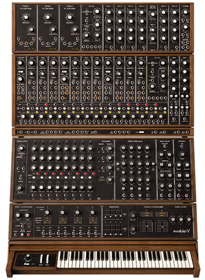 Que trouve-t-on dans le Modular V ? Je vais vous le dire après une grande inspiration : 9 oscillateurs, 2 LFO, 3 filtres, 1 générateur de bruit, 6 générateurs d’enveloppe, 2 VCA stéréo avec fonction « soft clipping », un mixer de 16 VCA (les 4 premiers sont linéaires et les 12 autres exponentiels), un séquencer 24 pas, une banque de 14 filtres, plus de 500 presets, un delay stéréo, un chorus, un phaser un ring modulator, une version (réussie) du célèbre filtre passe bas 24dB/octave de Moog, et un traitement TAE® du signal. On y trouve aussi un clavier maître avec tout un tas de modulations et de modes de jeu. Pratiquement tous les paramètres de tous les modules peuvent être assignables, via Midi, à des contrôleurs externes.