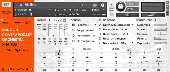 Concernant les sonorités, nous devrions parler d’orchestre à cordes, car dans le pack nous n’avons que six violons, quatre altos, trois violoncelles, et deux basses, doublées à l’octave par les violoncelles. Chaque section joue pour nous une centaine d’articulations différentes. Par articulation, j’entends la manière de jouer, avec ou sans archet, en écrasant les cordes ou en les frôlant à peine, par exemple.