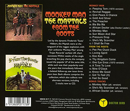 Alors que le reggae intègre le patrimoine culturel immatériel de l’Unesco, cette réédition couplée des Maytals prend une dimension particulière, d’autant que Toots Hibbert, le leader du trio vocal, est un pivot du genre. Influencés par le gospel, le rythm and blues et plus particulièrement par le catalogue Stax (Otis Redding, Sam and Dave…), The Maytals sortent « Monkey Man » en 1970. Paru initialement chez Doctor Bird avant son rachat par Trojan, ce troisième opus délivre « Monkey Man » et « Pressure Drop », deux des plus grands succès de la formation jamaïcaine, notamment au Royaume-Uni où ces morceaux seront repris par The Specials ou The Clash. Autre temps fort de la discographie des Maytals, « From The Roots », s’il est moins connu que son prédécesseur, réserve son lot de plages incandescentes comme « Koo Koo » ou « Pee Pee Cluck Cluck ». Rampe de lancement pour la carrière internationale de Toots, cette galette de 1973 préfigure le sublime « In The Dark » et « Funky Kingston », l’album de la consécration. Trois prises alternatives complètent l’entreprise, dont une version tonique du beau « She’s My Scorcher ». Certifié fat par Star Wax.