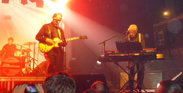Ce samedi soir l’excitation était à son comble, la superbe salle parisienne était bien remplie. Le set commence par « Cindirella » (extrait de The Sonics-8, sorti en 2010) et ça fonctionne toujours… Etonnement le public dans la fosse est encore timide. Mais heureusement les plus jeunes vont rapidement réagir et le pogo attendu se déclencher. Alors que tous les musiciens sont vêtus de costumes noirs un écran, en fond de scène, va projeter tout le temps du live des images vintage. Ce retour dans le futur, surtout lorsqu’on pense à l’âge avancé des membres originels, est une réussite. Geny Roslie (chanteur et organiste), Larry Parypa (guitariste) restent efficaces, soutenus par Dusty Watson (à la batterie) puis par les fidèles Rob Lind et l’excellent Freddie Denis à la basse et au chant. Les morceaux d’époque défilent ainsi que d’autres de leur dernier disque, l’époustouflant This is The Sonics (sorti cette année). Devant la scène, filles et garçons twistent et pogotent tandis que cris et hurlements fusent de toutes parts, c’est frénétique. Leur show se termine dans une transe totale sur le mythique « The Witch ». Tout est bien qui finit bien, tout le monde a survécu à cette tornade musicale. J’entends une voix concluant ce moment d’anthologie en disant : « J’y étais ». Un groupe qui n’a pas pris une ride. À voir et à revoir.
