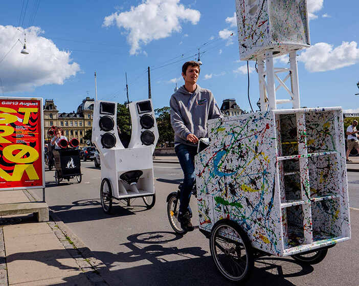 Je suis tombé amoureux de la culture sound bike dès l’été 2011. Ça a débuté par une sonomobile. Un bon ami à moi avait fabriqué un sound system en forme de wagon. Et nous avons commencé à nous balader avec. Puis en 2012, nous avons fondé United Sound Systems. Et nous avons fait notre première parade la même année. Au départ, ce wagon a été fabriqué pour être présenté dans le cadre d’un festival, mais nous l’avons amené à Copenhague. Nous nous sommes alors dit que nous pouvions l’utiliser en milieu urbain. La ville est très conviviale et elle est équipée pour les cyclistes (nombreux au Danemark, Ndlr). Il y a une vraie tendance vélo-cargo, à deux ou trois roues, qui permet de transporter des charges plus importantes que sur un vélo normal. En 2012, il y avait peu de personnes qui construisaient des sound sytems sur les vélos. Les gens installaient des sound, mais sur des chariots. Ou implantaient des dispositifs sur des wagons. Depuis, il y a beaucoup de personnes qui proposent des sound bikes. Tant qu'il est mobile, c'est cool ! Au festival de Roskilde, il y a un vaste campement, où vous pouvez vous promener et rider avec votre sound bike...