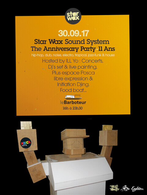 Retour en vidéo sur l’anniversaire des onze ans de Star Wax. C’était le samedi 30 septembre 2017, au Barboteur à Pantin. Et ce fut un moment riche en émotions et en « cascades » artistiques. Au choix, toute la journée, il y avait l’option de se pavaner au soleil au fond d’une chaise longue en sirotant une boisson, de participer à une jam de scratch avec nos camarades de Parlons Scratch, d’onduler, de se restaurer, de s’initier au Djing ou encore au dessin à l’Espace Posca Libre Expression... La diversité musicale était au rendez-vous grâce aux sets de Dj Ness, Dj Seep, Ant-1 et de Krak In Dub. Toute la journée, Yomek Piecemaker a peint Rocky Balposca, un robot de 70 centimètres de haut, fabriqué pour l’événement. À ses côtés Aetic a improvisé des floppes ou des panels sur des vinyles... le tout en live. Ce fut l’occasion de (re)découvrir au micro Tiemoko, Buitre Zamuro ou le flow ragga de Derfi One. Et le jeune duo Maysgold qui proposa un live house soulful des plus toniques. Plus de huit heures de bonnes vibrations, d’échanges, de découvertes bref d’épanouissement. Pour connaître le prochain rendez-vous, restez connectés en vous abonnant à la newsletter officielle de Star Wax, ici. Ou follow us via la page Instagram, Facebook ou Twitter.